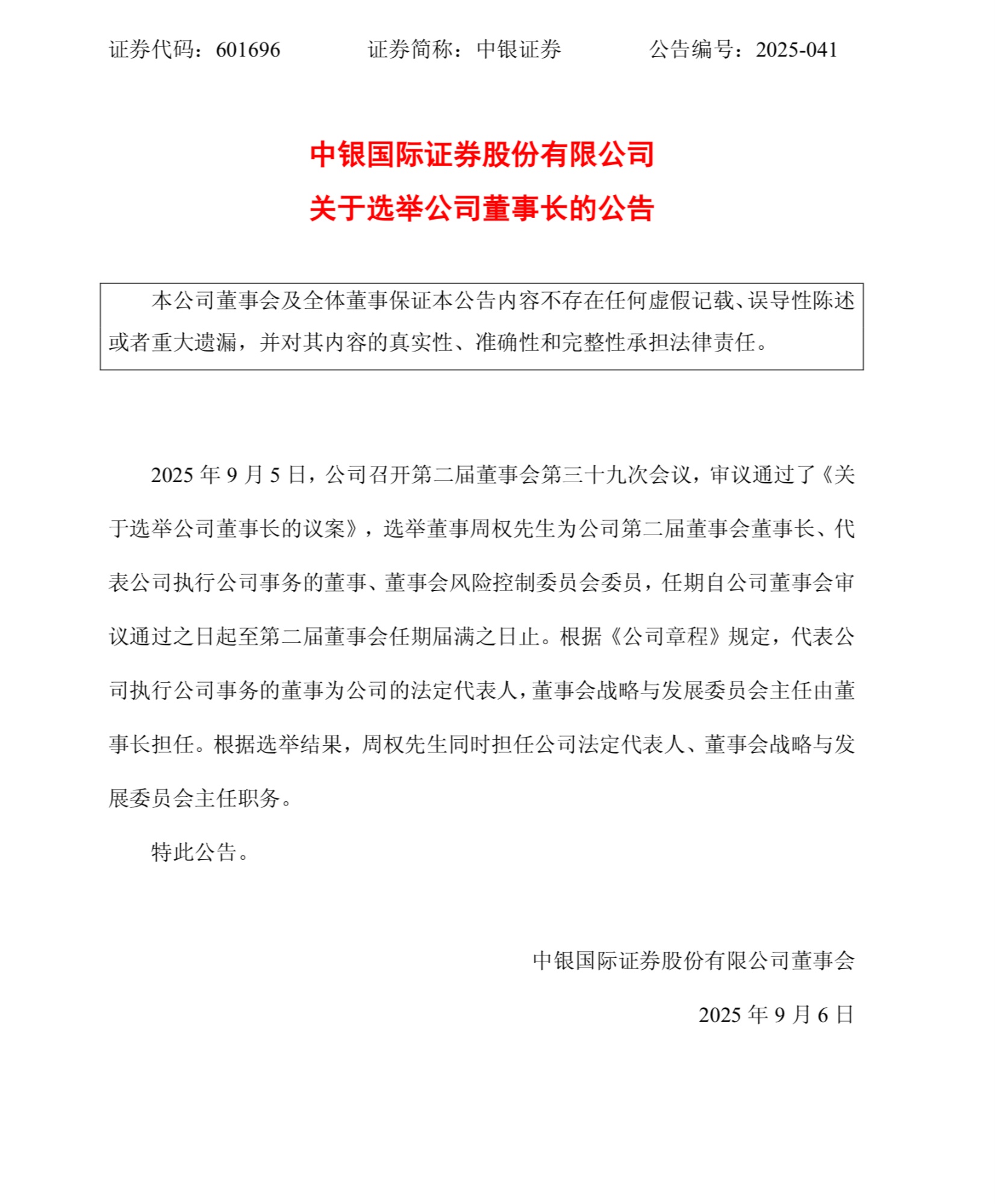 董事长职位空缺两个多月后,中银国际证券股份有限公司(以下简称中银证券,601696.SH)9月6日发布董事长变更公告,选举周权为董事长。