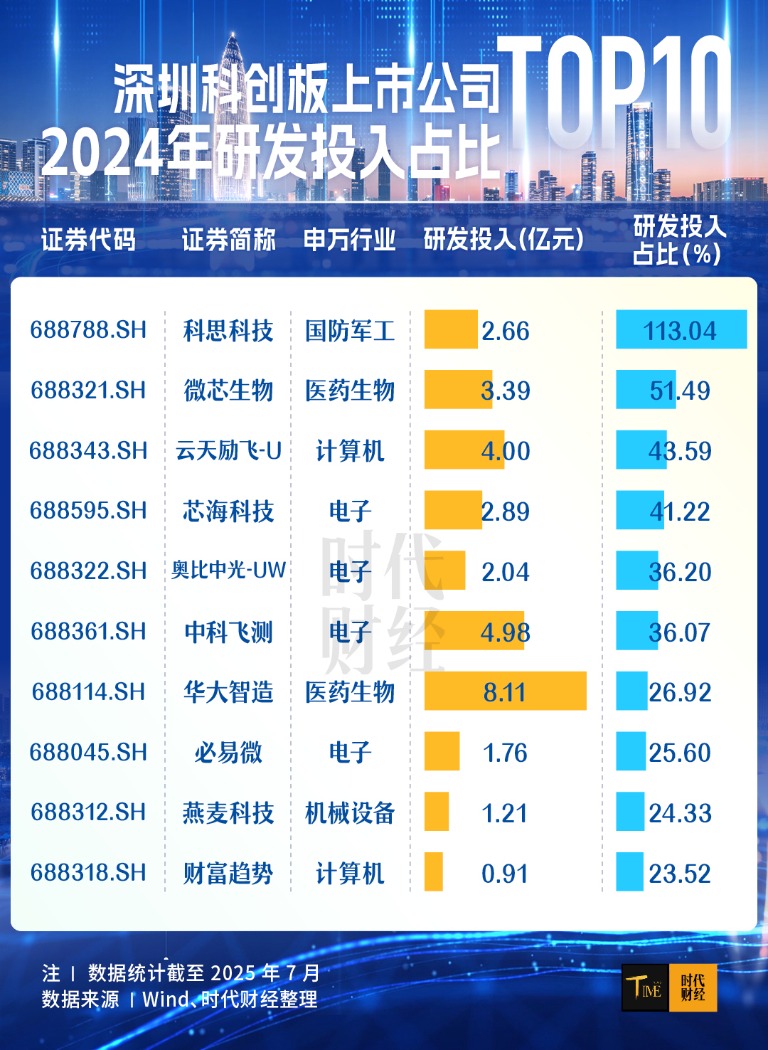 据时代财经梳理,50家深圳科创板上市公司2024年累计研发投入金额达到127.41亿元,研发投入占营业收入比例中位数为13.66%;其中,15家公司研发强度超20%。