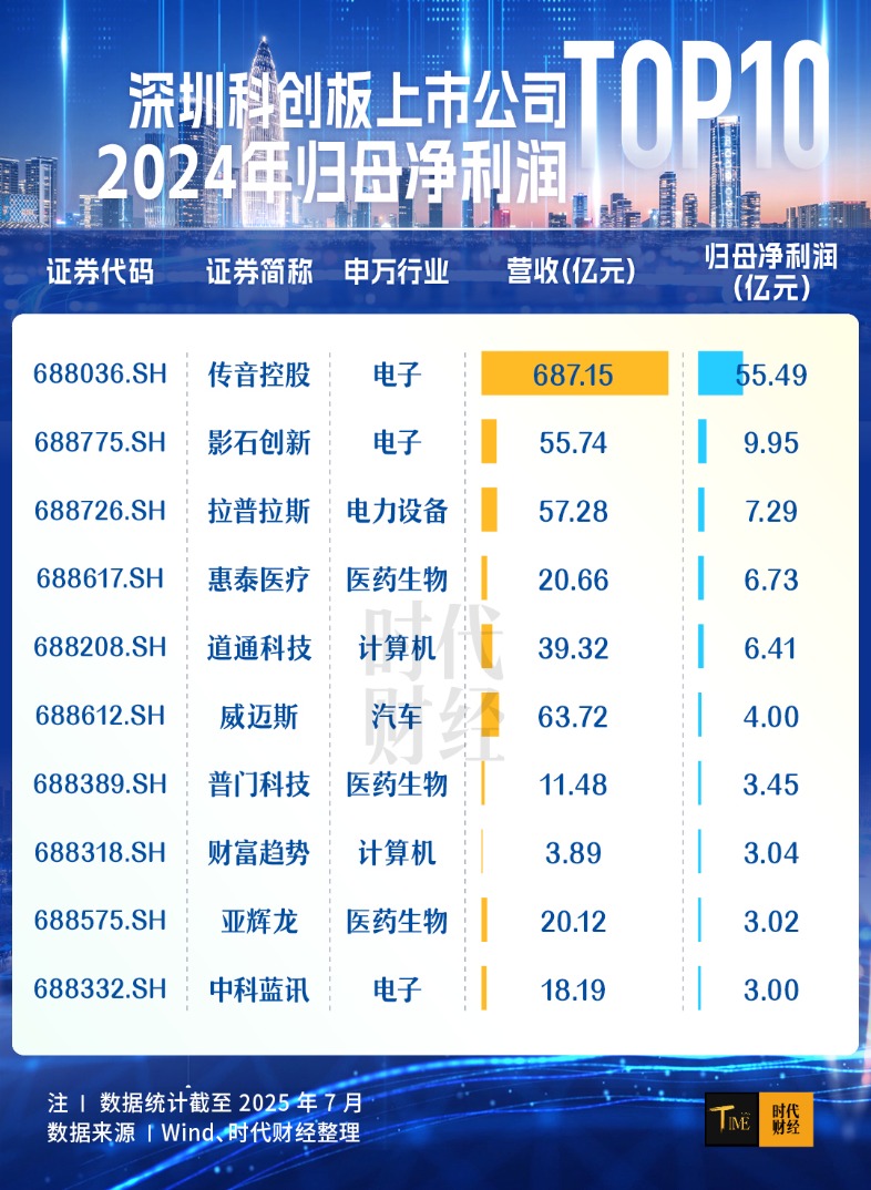 基于此,时代财经以2024年年度报告为准,对深圳科创板上市公司进行了全面梳理,从上市时间、盈利水平、研发投入、市值等多个维度进行筛选,并重点分析了营收、净利润居前,研发投入或市值较大的企业,以此探寻深圳前沿科技快速发展和科技成果快速转化方面的强大实力。